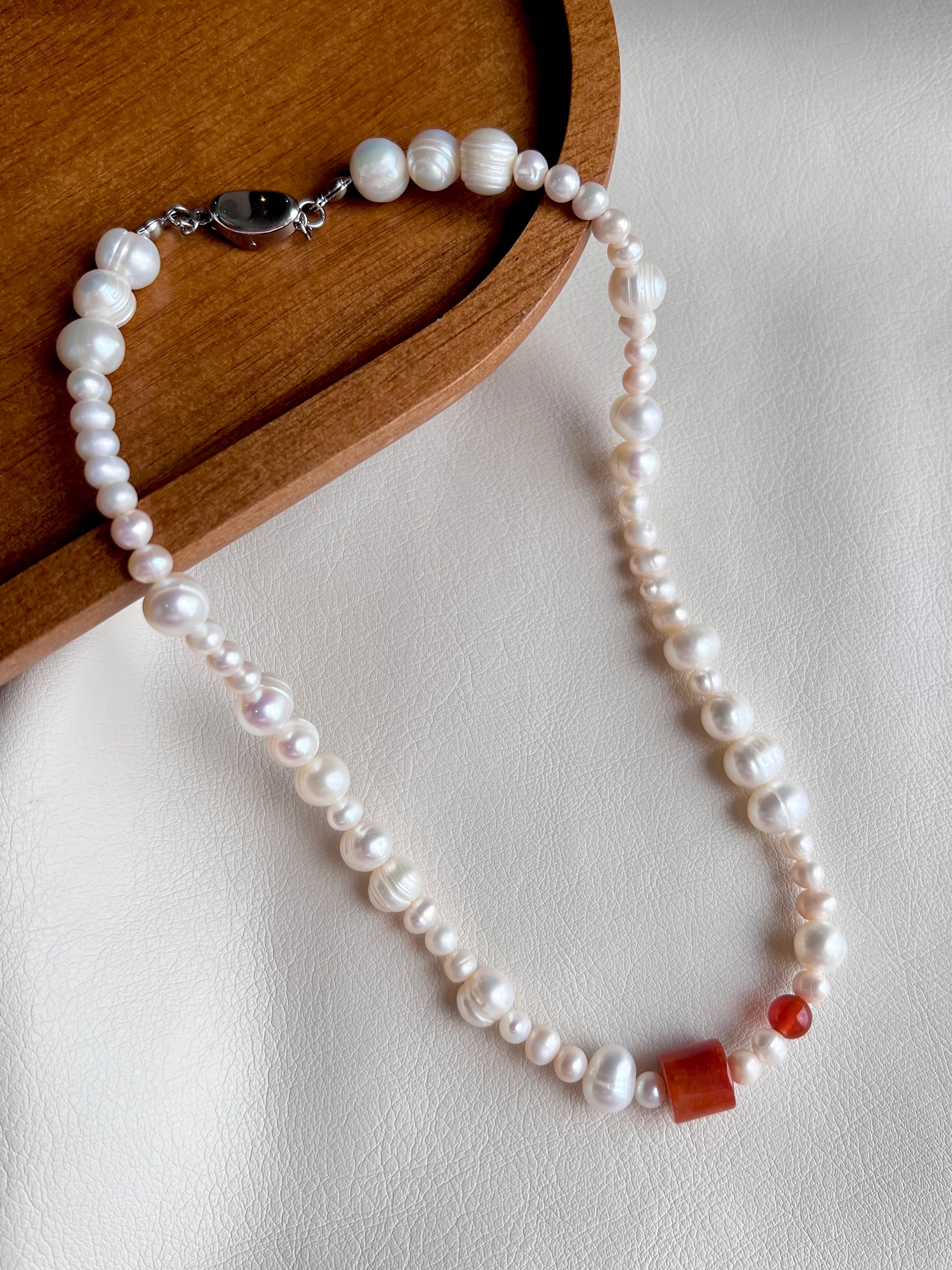 Freshwater potato pearls in alternating sizes, accented with fired red jade barrel beads. Red jade is believed to bring passion, vitality, and good fortune.