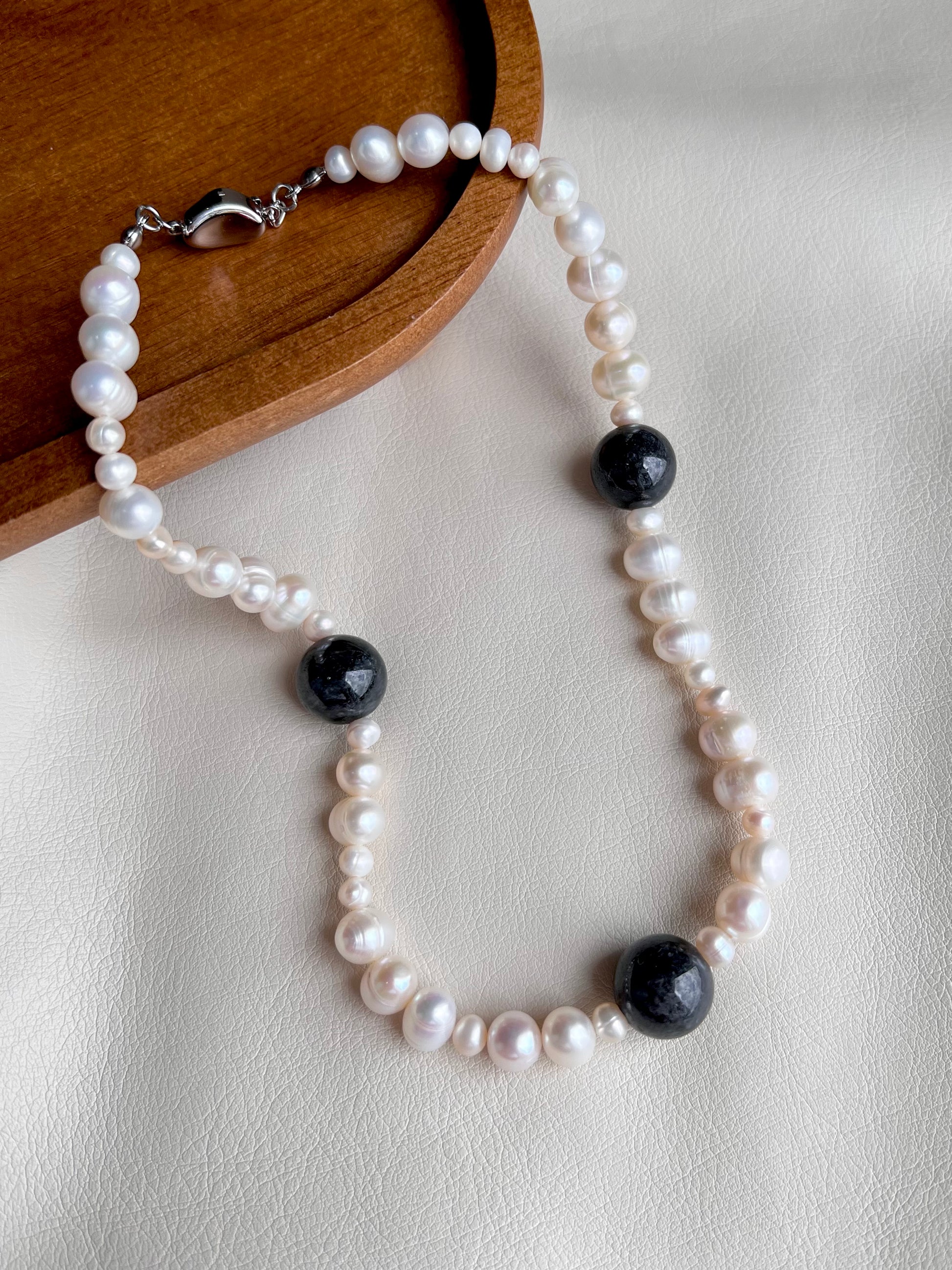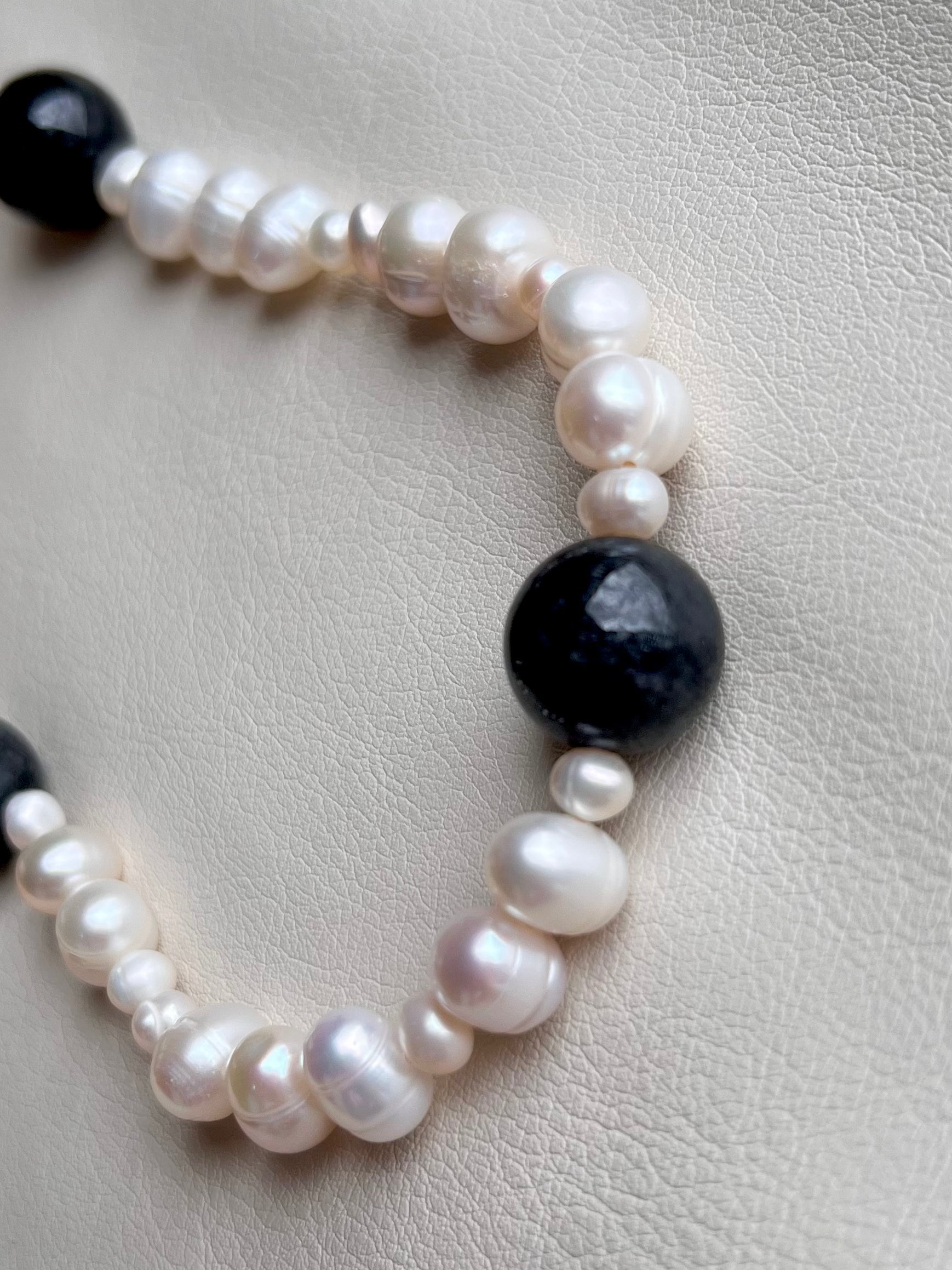 Freshwater potato pearls with black jade. Black jade is known for its protective and grounding energy, as well as its connection to prosperity and resilience.